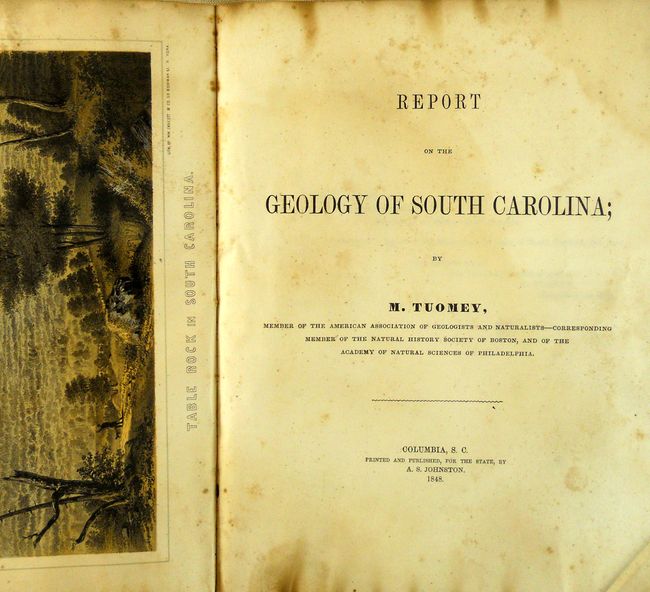 This important map is the first geological map made of South Carolina. It is complete with the original Report on the Geology of South Carolina. The map provides 15 different formations shown via coloring and pattern. The legend also locates Iron, Gold, Copper, Lead, Mangaese, Bismuth, Plumbago, and Soapstone. A large and colorful profile shows the region from Charleston through Columbia to Saluda Gap. The report contains numerous engravings in the text plus the folding Map of the Iron Ore and Limestone Region of York and Spartansburgh Districts (11" x 7"), which identifies three types of iron ore and limestone. Octavo, 293pp, plus Appendix and Index 56pp.