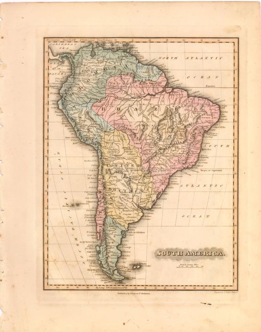 This map of South America depicts a large United Provinces, consisting of Bolivia, Paraguay, Uruguay, and northern Argentina. Colombia extends to include Venezuela and Ecuador, and Patagonia encompasses the southern tip of the continent. Lucas' General Atlas is known as one of the finest general atlases produced in the U.S. at the time, due to the high quality paper, superior engraving quality, and attractive coloring style. Engraved by J. Yeager.