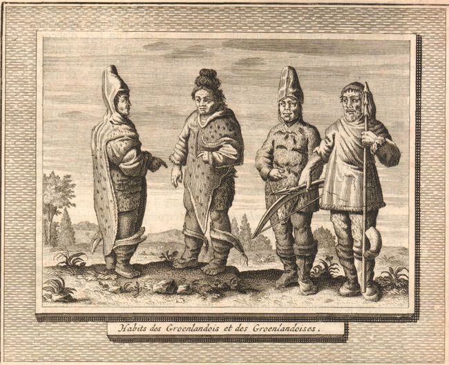 B. [Lot of 2] Hommes et Femmes de Groenlande [and] Habits des Groenlandois et des Groenlandoises, dated 1636, Black & White (6.5 x 5.3"). These are two scenes of native Greenlanders. The first shows the clothing worn by the natives and the second is a close-up view of three men and a woman. Each on a full sheet of French text (7.3 x 12.5"). (A)