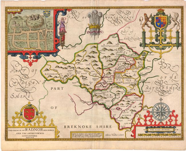 This beautiful map of Radnorshire was engraved by Jodocus Hondius. It includes four decorative cartouches, a view of the castle at Radnor, scale of miles, coat of arms, title, also Prince of Wales feathers and fancy script lettering. Speed rarely credited his sources, but in this case he credits his great predecessor, Christopher Saxon, with the basic information on this map. Saxon published his atlas in 1579 and included regional maps of Wales. Speed wanted to make his atlas distinctive, so he separated his maps into individual counties. There is modest detail throughout the map. English text on verso with the imprint of John Sudbury and George Humbell, published circa 1627.