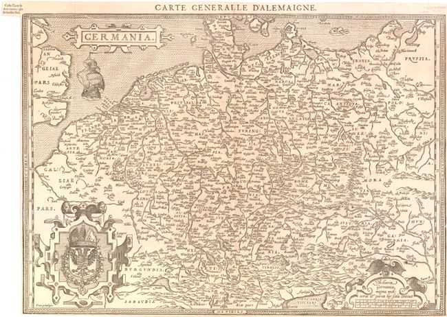 Scarce map from an edition of Sebastian Munster's "Cosmographia", which was translated into French and issued with new maps by Francois de Belle-Forest. The map is a copy of Ortelius' map of the same title. It covers the German Empire, which at the time included nearly all of central Europe. Interestingly the map was produced by the woodcut method, rather than a copper engraving. The map is beautifully decorated with the royal arms enclosed in a cartouche, strapwork title and scale of miles cartouches, and a ship and sea monster in the horizontally stippled sea. Another title, Carte Generalle D'Alemaigne, above neatline. A rare and sought-after map, issued only in one edition.