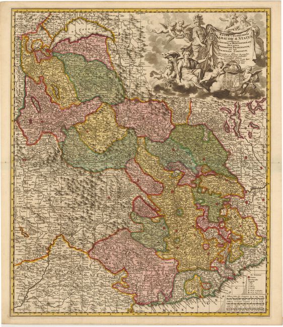 This highly detailed map of northern Italy extends from Lake Geneva in the north to the Ligurian Sea in the south, including parts of Switzerland and France. A legend at bottom identifies castles, abbeys, monasteries, fiefdoms, and towns of various sizes, including Torino, Novara, Geneva, Grenoble, Nice, and Monaco. Includes a decorative title cartouche with numerous putti, the arms of the Duchy of Savoy, and Athena, goddess of war and wisdom. An index to the map with an explanation in both French and Dutch is on verso.