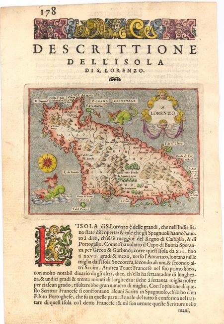 This is a charming map of the island of Madagascar embellished with a decorative title cartouche, fanciful sea monsters, a compass rose, and a stippled sea. Printed on a full page with Italian text (7 x 10.5"). Engraved by Girolamo Porro.