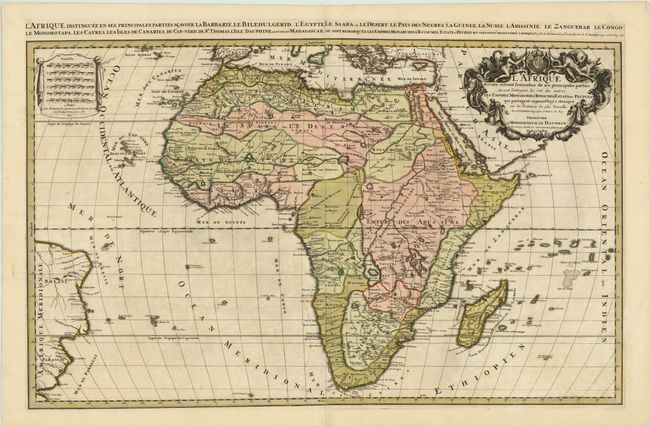 This striking map is the Mortier version of Jaillot's 1674 map of the continent of Africa. It can be distinguished from the earlier Jaillot map of Africa by the date and minor changes in the title in the top margin and it does not carry the engraver's imprint. Based on Sanson's second map of Africa (1668), it presents the standard Ptolemaic description of the source of the Nile. However, Jaillot introduced a new depiction of the rivers south of these Ptolemaic lakes. The Zambeze River appears above the Zambere and Rio de Spiritu Santo, all of which flow into the Indian Ocean. A large section of South America is shown and two St. Helena islands appear - a common error in maps from this period. The large distance scale cartouche has six scales. The very large and decorative title cartouche includes a tumult of figures, cornucopias, elephant, crocodile, lion and ostrich under the coat of arms of the Dauphin. Two sheets joined, as issued.