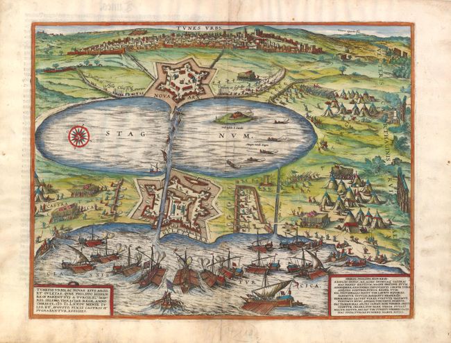 Dramatic view of the city of Tunis illustrating the Turkish siege of 1574. The city, which had been occupied by the Spanish since 1535, is protected by two forts and an inner harbor labeled Stagnum. The Turkish fleet of oared ships fills the outer harbor and skirmishes are depicted throughout the view. This view was first published in 1575, thus providing its European audience with a contemporary view of this important event. German text on verso.