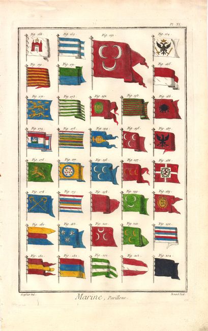 Handsome copper engravings from Diderot’s encyclopedia comprising 8 sheets, being the complete set of 248 marine flags, some decorated with coats of arms. Drawn by Goussier and engraved by Benard.