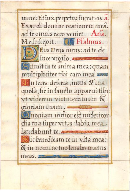 This vellum leaf from a French Book of Hours is a fine example of the Northern Renaissance style. The scribe used dark brown ink and wrote in a fine rounded Roman hand. Each verse begins with a decorative initial, alternating in red and blue with the letter painted in gold. In addition to the large initial on verso, there are five small initials in red, blue and gold and five line fillers in different colors and shapes, and the text is framed in a gold line. There are six small initials and four line fillers on recto. The large initial begins Psalm 62.