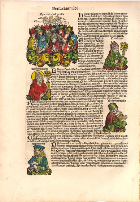 Hartmann Schedel's Nuremberg Chronicle (Liber Chronicarum) was published in two editions, Latin and German, both in 1493, appearing in print just before Christopher Columbus' discoveries completely re-shaped the European view of the World. This splendid work presented the history of the world in a pictorial encyclopedia with approximately 285 pages of text and 1,800 woodcut illustrations. Among these illustrations are views of towns and cities throughout Europe and the Near East. The majority of these views are entirely imaginary. In fact, 49 of the views are actually printed from the same group of 14 woodblocks. There are also 30 double-page views of cities with more realistic images. In addition to the topographical images, there are an enormous number of other subjects, including diagrams of the Creation, comets, family trees, portraits & biblical scenes. The text was compiled and edited by Hartmann Schedel, printed by Anton Koberger, with illustrations designed by Michael Wohlgemuth and Willem Pleydenwurff, who cut the woodblocks, probably with the assistance of their apprentice, Albrecht Durer.