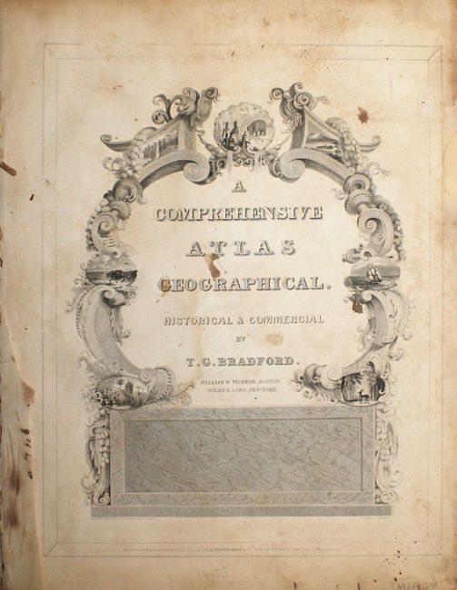 Large quarto, quarter leather spine and tips over marbled-paper covered boards, four raised bands with gilt title on spine, marbled pastedowns, 180 pp. Contains an engraved pictorial title page, advertisement, table of contents, 10 engraved plates (three colored), and 65 engraved maps. All maps are included, but the atlas is missing the frontispiece of The Five Varieties of the Human Race, three text pages containing information on southern South America, northern and southern Europe, and China, Japan and India, and the front and back free-endpapers. Printed by William D. Ticknor from Boston and Wiley & Long from New York.