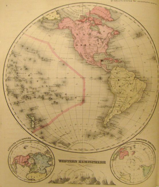 This school geography book contains complete lesson plans for learning world geography. The book begins with definitions of terms, and then is divided into lesson plans for each geographical area. Each lesson plan features one map and contains dozens of map questions about the mountains, rivers, cities, and other landmarks, and also includes information about key resources and exports. The map of Nebraska, Kansas, Dakota, Colorado and Montana shows an unnamed Wyoming attached to Dakota with the "Oil Region" in the northwestern portion. At the end of the book is a test containing hundreds of questions, such as "What peak in the Caucasus is higher than any mountain in Europe?" and "What countries are richest in quicksilver?" 33 maps (1 double-page). Quarto, orange pictorial paper boards, 110 pp.