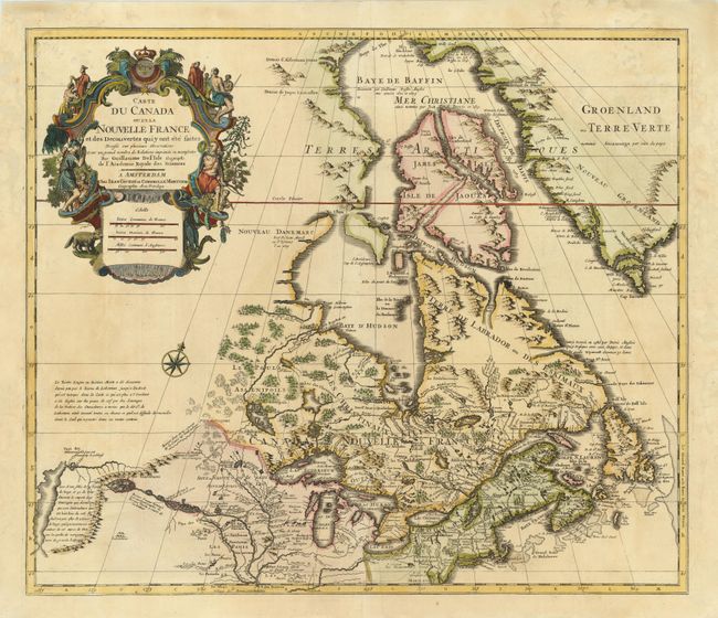 First issued in 1703, this richly detailed map provides the most accurate rendering of the Great Lakes of the time, with the lakes fully enclosed and properly placed in longitude and latitude. Delisle's map of Canada and the Great Lakes is one of the most outstanding and influential maps of the eighteenth century. Detroit marks its debut on this map, only two years after its founding. Delisle's cartography is very meticulous and adds new information from Joliet, Franquelin, and the Jesuit explorers. It correctly positions the Ohio River but confuses its name with the Wabash River. West of the Mississippi Lahontan's fictitious Riviere Longue is prominently depicted. In Canada special attention is given to the rivers and lakes between Hudson Bay and the St. Lawrence, and Lac de Assenipoils (Lake Winnipeg) connects to Hudson Bay. Sanson's three islands of the Arctic are retained. The exquisite cartouche with a beaver, natives, priest and friars, was engraved by Guerard. This is the second state of the map and remains essentially unchanged from the first edition.