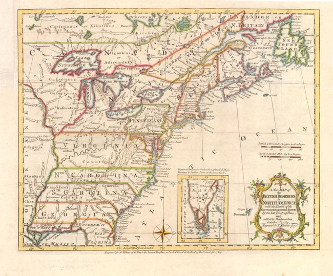This very historical map illustrates the British colonies after the Treaty of Paris and at the conclusion of the French and Indian War in America. The treaty ended French colonial ambitions in North America with minor exceptions. As a result, Spain ceded East and West Florida to Great Britain, France relinquished the title to the Louisiana Territory to Spain, and the Mississippi River was established as the British-Spanish Boundary. The map reflects the claims of the southern colonies that their charters extended to the Mississippi River. Also of interest are the names and locations of many Indian tribes and nations located away from the more populated areas of English settlements. An inset of East Florida on the same scale lies between the coastline and the decorative rococo-style title cartouche. A simple compass rose rests in the Atlantic.