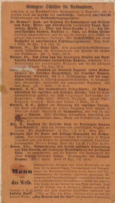 Traugott Bromme was one of the most prolific German travel writers in the mid nineteenth century. He issued a number of travel guides to America, as well as a number of important German atlases. His work was very influential in the influx of Germans who comprised the largest group of immigrants to the United States between 1840 and 1880.