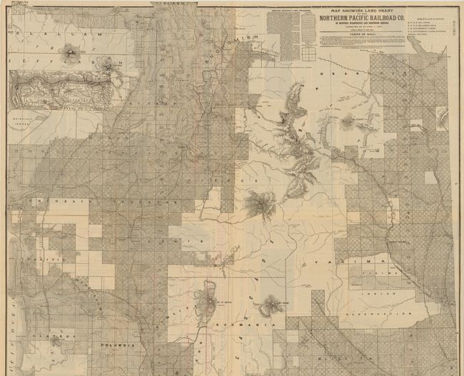 This is a scarce land promotion broadside, published by the Northern Pacific Railroad. On one side is the large "Map Showing Land Grant of the Northern Pacific Railroad Co. in Western Washington and Northern Oregon. Corrected up to April 1, 1890." The map occupies the entire side and features very fine detail throughout the region. It extends from the Pacific Ocean eastward to Ellensburg and beyond to Port Eaton. The city of Portland is in the south and the map continues north up to the Strait of Juan de Fuca. Port Townsend, Port Angeles, Seattle, Astoria, and more are located. The map describes the terms of sale including the maximum number of acres one person may purchase, the terms (7% interest) and price ($2.60 - $6 per acre). The forty and fifty mile limit lines for the railroad are shown. The legend identifies railroad lands available and those already sold - no doubt to create a sense of urgency.