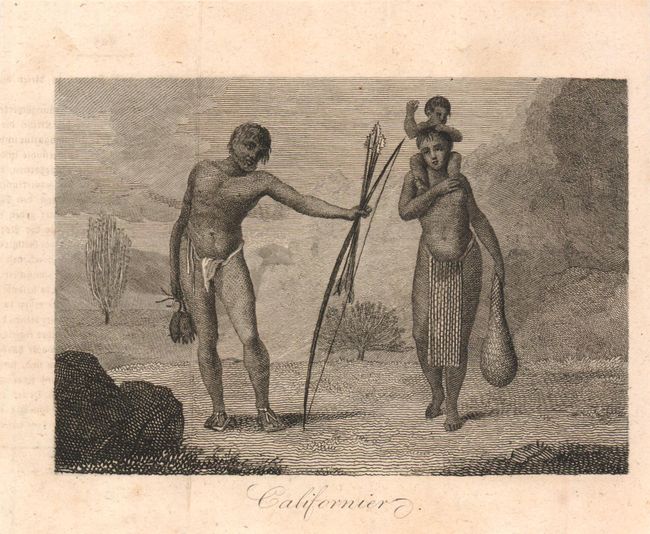 These small, rare engravings come from Zimmernan's Taschenbuch der Reisen oder unterhaltende Darstellung der Entdeckungen des 18ten Jahrhunderts... and features the first German description of California as it was under Spanish rule. Included are:
