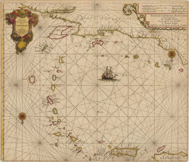 This rare sea chart of the Lesser Antilles extends from the northern coast of South America to the eastern tip of Hispaniola. Two compass roses orient north to the bottom. The map is adorned with a decorative title cartouche, a secondary title cartouche incorporating the scale of miles, and a large sailing ship.