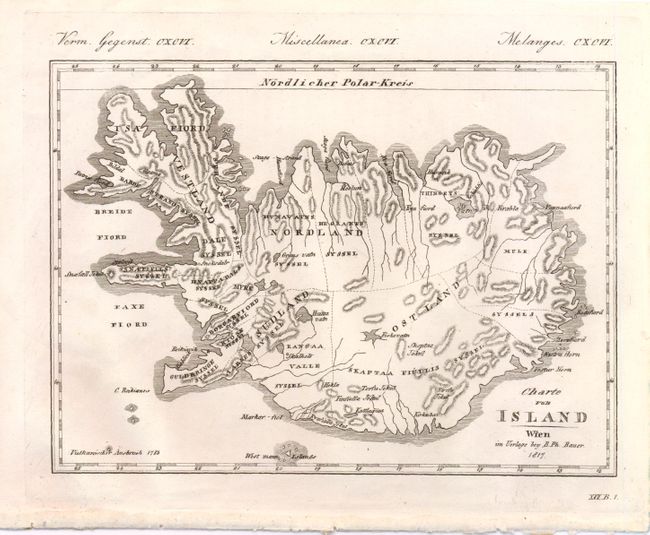 A. [Lot of 2] Charte von Island [and sheet of text], Bauer, dated 1817, (8.5" x 6.3"). Map shows the entire island of Iceland with political divisions delineated. There is basic detail of the coastline and mountains in hachure. Included with the map is a sheet of text in both German and French describing the island.