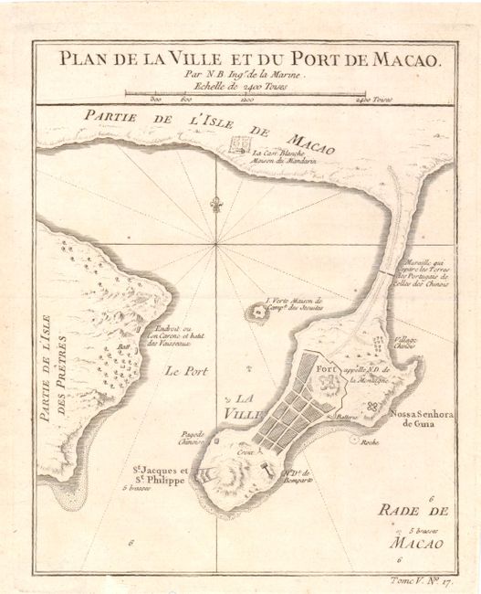 Copper engraved plan of city and harbor of Macao, an important Portuguese trading post and center of activity for Catholic missionaries. The city is shown as several blocks of buildings with the fort adjacent and located at the top of a hill. Also locates the cannon battery labeled St. Jacques et St. Philippe, the Chinese village, a Pagoda, the Jesuit monastery on Green Island (I.Verte), and the military battery across the harbor. Macao was earlier an island connected to the mainland by a narrow sand bar that eventually filled in, converting Macao to a peninsula as shown here. Macao was administered by Portugal for 442 years until 1999 and today enjoys a semi-autonomous relationship with China, similar to Hong Kong.