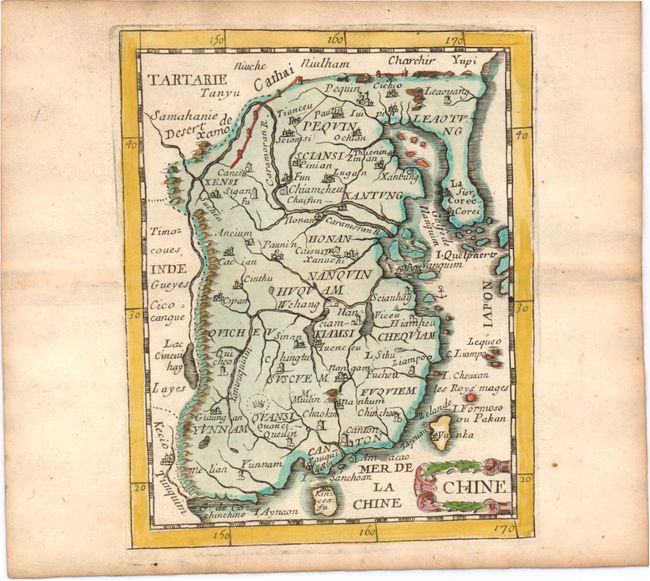 This miniature map of China, Korea and Taiwan depicts major towns and key topographical features. The Great Wall is illustrated at top and Korea appears as a strangely shaped peninsula. Pierre Duval was Nicolas Sanson's nephew and pupil. He published a wide range of atlases and individual maps including a fine miniature world geography with many of the maps based on Sanson.