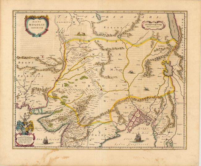 This map depicts the Empire of the Great Moghul in northern India, including the region from Iran to Burma (Myanmar). The important travel route from Kabul to Surat is the most prominent feature of the map. This was the route traveled by the embassy of the Englishman Sir Thomas Roe to the Moghul emperor Jahangir in 1615, as derived from a map published by William Baffin in London in 1618. This Dutch version of Baffin's map remained the standard Dutch view of the region throughout the seventeenth century. Finely decorated with strapwork title and scale of miles cartouches, a dedication with coat of arms, sailing ships, elephants and camels. French text on verso.