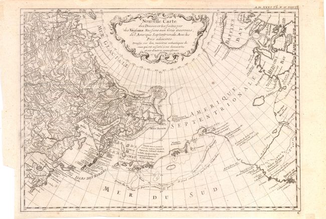 This is a rare, reduced-size version of Gerhard Muller's landmark map of 1754 showing the discoveries of Captains Bering and Tschirikow. Muller was a German scholar who worked for the Russian Imperial Academy of Sciences. He originally published his map in response to Joseph Delisle and Philippe Buache's map that showed previously unknown Russian discoveries and an elaborate (and entirely speculative) depiction of the imaginary voyage of Admiral De Fonte through a Northwest Passage. Muller's map shows an elongated landmass roughly in the shape of the Alaskan Peninsula and the Aleutian Islands. The speculative Northwest Passage is shown nearly connecting to Hudson Bay via a mythical River of the West. Muller's map was copied numerous times by different publishers due to increased interest in the region and the De Fonte controversy. This is a rare and fascinating addition to any collection of the Pacific Northwest.