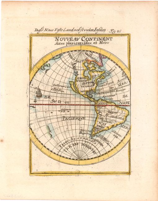 This is the second state of this charming miniature map drawn in a hemispheric projection, with the various seas named on the map. California is depicted as an island on the Briggs model, with a flat northern coast. Part of the coasts of New Guinea and New Zealand are depicted but not named, and the named Solomon Islands dominate the Pacific. A minutely engraved galleon decorates the map. Titled above in German: Das Neue Veste Land Nebst Vielen Inseln with fig. 86.