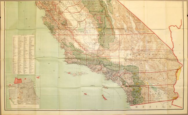 This is a superb and very colorful large-scale map of the state printed on two unjoined sheets, each 47 x 29.5 inches. The map shows in great detail the extent of public surveys, hydrology and topography. It also delineates Indian reservations, military posts and reservations, forest reserves, as well as Yosemite and Sequoia National Parks. Completed and proposed railroads are also detailed and named. The top sheet includes inset plans of Los Angeles and San Diego, with a plan of San Francisco and a list of 533 Private Land Grants on the bottom sheet. This is the uncommon large edition that when joined would measure an impressive 47 x 59".