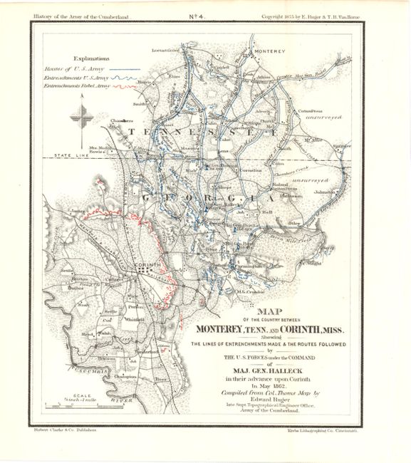 Included are nine maps by Edward Ruger illustrating the various Civil War battles in Tennessee from the atlas of Van Horne's "History of the Army of the Cumberland." Ruger worked for the Topographical Engineers and had access to the War Department maps and plans, which he used in the production of these finely detailed and well engraved maps. Each shows highly detailed troop actions and movements with color overprinting. Published by Robert Clarke & Co., and printed by the Krebs Lithographing Co., Cincinnati.