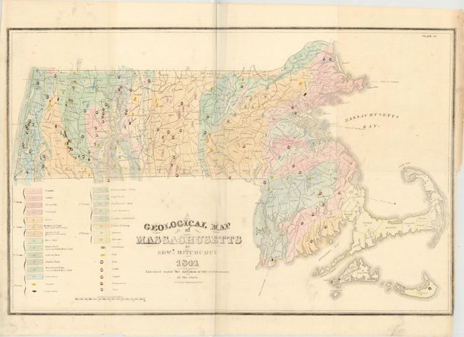 Hitchcock was an eminent professor of chemistry and natural history at Amherst College and was selected in 1830 to conduct a general survey of the Commonwealth of Massachusetts. The publication of his first report and map in 1832 marked an epoch in American geological work as this was the first survey of an entire state conducted at public expense. The first edition was reprinted in 1833. In 1837, he was commissioned to make a further geological and mineralogical survey, which was updated in 1839 and reprinted here in 1841. A very lovely map that has 21 geologic groups shown through color and design, plus symbols to further locate deposits of plumbago, coal, iron, lead, copper, manganese and zinc. Early lithographed map published by B.W. Thayer in Boston. These maps were issued in small quantities and are seldom seen.