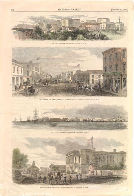 This sheet includes four panoramic views of Houston and Galveston, Texas, all sketched by Theodore R. Davis for Harper's Weekly. Originally published in the October 27, 1866 issue of Harper's Weekly "A Journal of Civilization." English text on verso.