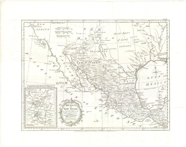 This is a very attractive map of the American Southwest and Mexico. California is labeled New Albion with no detail outside of a few coastal place names. The region of present-day Arizona and New Mexico is well delineated with numerous Indian villages and the locations of missions. The area from New Mexico to Louisiana is named as "Great Space of Land Unknown." The small Texas settlement of Cenis is near the New Kingdm. of Leon. An inset shows Mexico City on the large Lake of Mexico. Finely engraved with a decorative title cartouche and compass rose. Published by W. Strahan and T. Cadell.