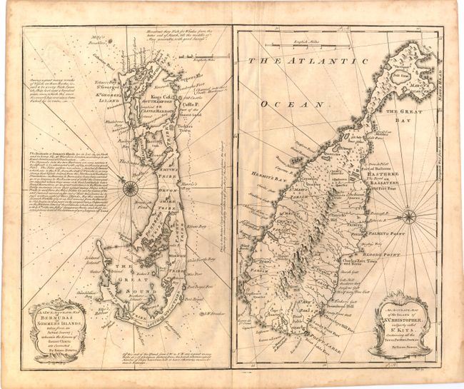 This sheet contains maps of Bermuda and St. Kitts, each enclosed in its own borders. The map of Bermuda is oriented with northeast at the top, and depicts the roads, towns and tribes on the island, as well as navigational hazards in the surrounding waters. There are several notes on the map giving more detail about the islands. The map of St. Kitts is oriented with east at the top and depicts numerous small towns, parishes, and the topography of the island. Each map is adorned with an baroque-style title cartouche.
