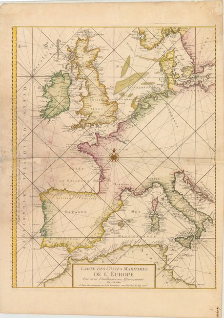This sea chart of western Europe is centered on a large compass rose and extends to include southern Norway and Sweden and part of northern Africa. Detail is limited to the coasts, with numerous place names shown. Large sand banks in the North Sea are also prominently depicted. Printed on two sheets, joined as issued.