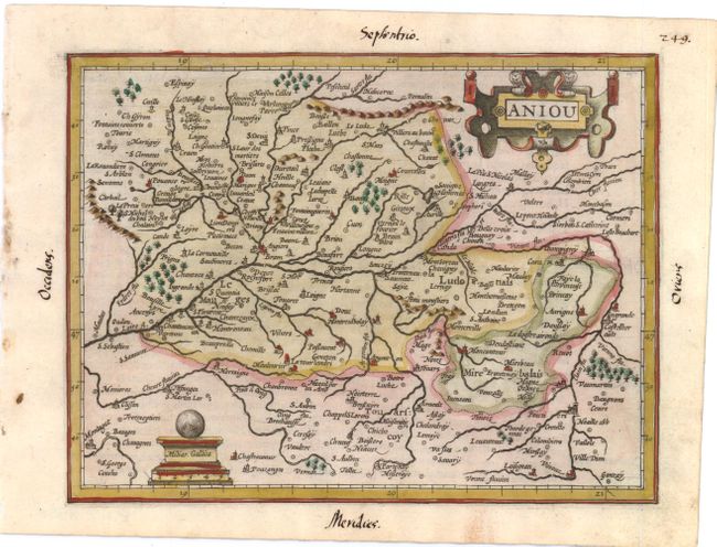 A delicately engraved small map of Anjou and the Loire River Valley naming scores of tiny villages with charming pictorial topography of mountains and trees. The map is embellished with an elegant strapwork title cartouche and a scale of miles cartouche. This is from the first edition, with Latin text on verso.