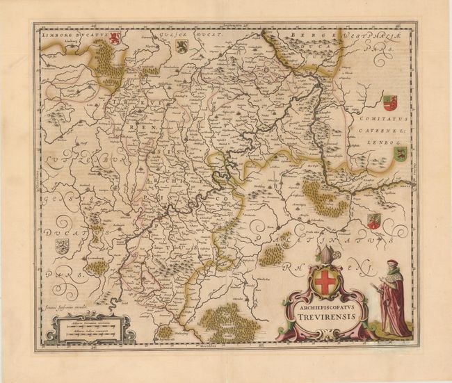 This copper-engraved map covers the Reinland Pfalz area, a wine growing region through Germany, Luxembourg and France. The map is filled with details of towns, villages, forests and rivers. Coats of arms also decorate the map, indicating the various duchys and bishoprics. The strapwork title cartouche is topped with a bishop's hat and is accompanied by an ecclesiastical figure in robes. German text on verso.