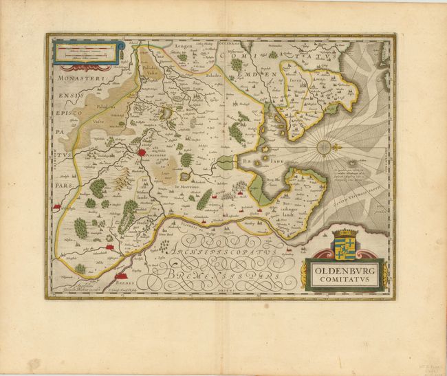 This highly decorative and very attractive map of the vicinity of Oldenburg and Bremen shows the Jadebusen and the estuary of the Weser. The topography and towns are beautifully detailed with nice representations of the forests and river system. The map is oriented with north to the right by a nice compass rose. The map was beautifully engraved by Everard Simonsz Hamersveldt who worked for all the important cartographic publishers of the period including Hondius, Jansson, Blaeu and Speed. Spanish text on verso.
