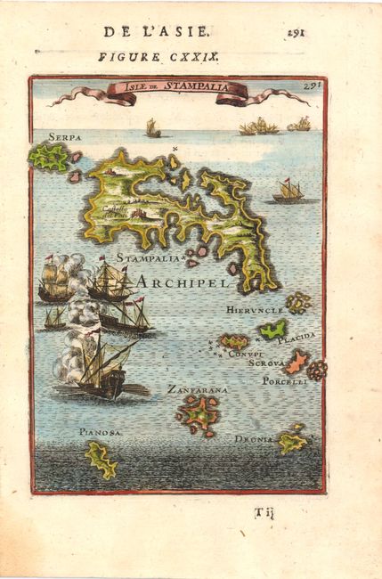 A lovely bird's-eye view of the Greek Isle Astypalaia (Stampalia) and several neighboring islands in the Aegean Sea. Numerous ships sail in the sea, including several engaged in battle.