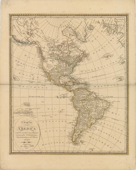 Large attractive map of the Americas, extending to include the eastern tip of Russia and part of western Europe. There is good detail throughout except in the northwestern regions of North America, which are left largely blank with the notation Unbekante Gegenden (unknown areas). The United States is depicted with its new acquisition of Louisiana Territory but still confined east of the Rocky Mountains, and several settlements in Texas are named. The Colombia River is shown with a dotted line connecting it with another river to the north, leaving open the possibility to the long sought navigable passage across North America. The Hawaiian Islands are shown as the Sandwichs Inseln with phonetic spelling for the individual island names. Between Hawaii and California there is an erroneous group of islands with Spanish names. These islands were introduced on maps in the mid-18th century and were not corrected until the early 19th century. The South American continent is very well mapped and filled with detail, although the mythical Parime See is still shown in Guyana. The map is adorned with a simple oval title cartouche and a decorative border.