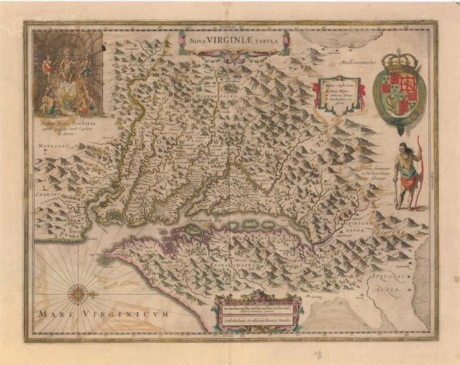 This graphic map is Henricus Hondius' version of Capt. John Smith's important map of 1612, drawn from his brother's map of 1618. After the death of Jodocus Hondius in 1629, his widow sold a number of plates to Blaeu. Angry at the sale to a competitor, Henricus and Joannes Jansson engaged engravers to cut new plates, which were largely based on Jodocus' work. This is the 5th derivative of Smith's map. It is beautifully engraved with topographical features and the locations of scores of Indian villages. In the upper left corner is an engraving of the great Indian chief Powhatan seated on his throne and surrounded by his subjects. A Susquehanna chief, facing in toward Chesapeake Bay (opposite of Jodocus' plate), is depicted on the right under a coat of arms. Latin text on verso, published between 1647-58.