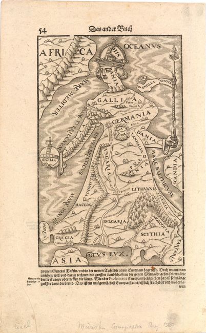 This is one of the most famous of cartographic oddities, showing Europe in the shape of a woman. The representation of Europa Regina, or Queen of the World, was first drawn by Jonannes Bucius in 1537. This simplified version appeared in several editions of Munster's Cosmography from 1580 onwards. West is shown at top with Spain forming the crown and head, France and Germany the neck and bust, Bohemia the heart, Italy the left arm holding an orb (Sicily) and Denmark the right arm holding a scepter with Britain as the flag. The remainder of the figure is a flowing robe with Greece and Russia at the feet. It has been argued that instead of a woman, the map represents Charles V of Spain, modeling a Europe that had Spain as its crown, or that it symbolizes a Habsburg-dominated Europe. Whatever the source, this is an extraordinary example of the art of mapmaking. German text on verso.