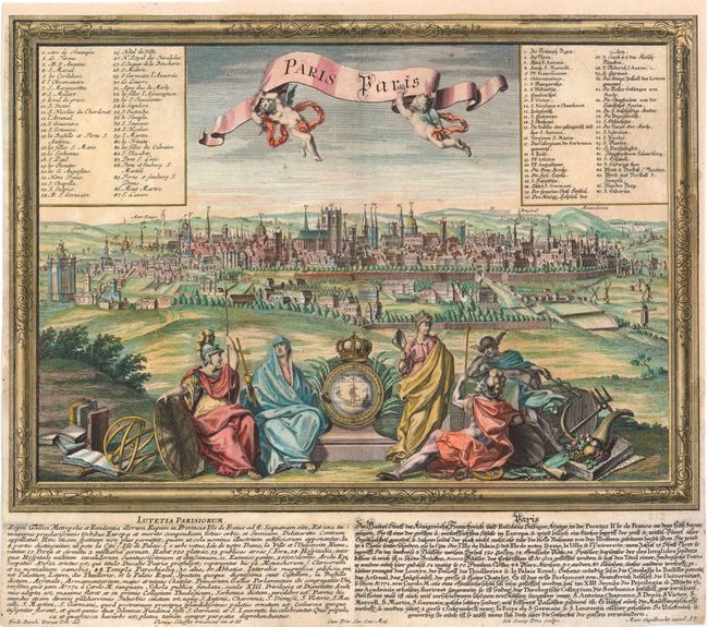 This rare decorative bird's-eye view of Paris includes numbered keys in French and German identifying 47 locations. The title banner is held aloft by two putti, while five allegorical figures are portrayed in the foreground of the view. Minerva and a saint are on the left, while Prudence, Mercury and a soldier are on the right. In between them is the coat of arms of the city surmounted by the Royal Crown. The view is encased in a delicately engraved picture-frame style border, below which are brief descriptions of the great city in Latin and German. This lovely view was drawn by Werner and engraved by Iohannes Georg Pinz, with ornamentation by Thomas Scheffler. Published in Augsburg by Martin Engelbrecht.