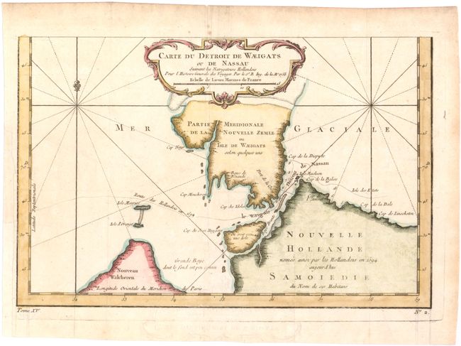 A boldly engraved copperplate map that is centered on the Russian islands of Novaya Zemlya and Pechorskaya Guba, here Nouvelle Zemble and Grande Baye. The detailed chart shows the lower part of the island and mainland. Embellished with rhumb lines, fleur-de-lis and fancy cartouche.