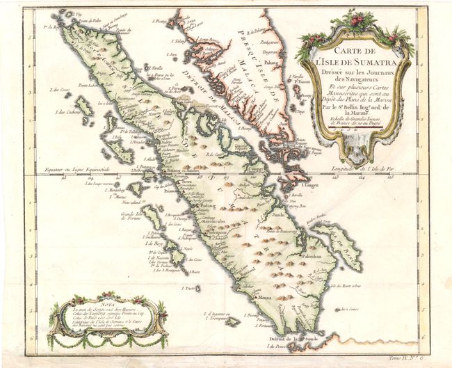 This finely engraved copper-plate chart shows all of Sumatra and the southern portion of the Malaysian peninsula. Singapore is not identified, but several other lesser islands are named including Tioman Island, Banca, and Penang, plus many off the west coast of Sumatra. Good detail of the Straits of Malacca and the Detroit de Sincapour. The cities of Palembang, Jambi, Manimcabo, Aceh and Batang are located, but not Medan. Decorative French rococo-style cartouches contain the title and a second one at lower left for notes. At lower right below neatline is "Tome IX. No. 6."