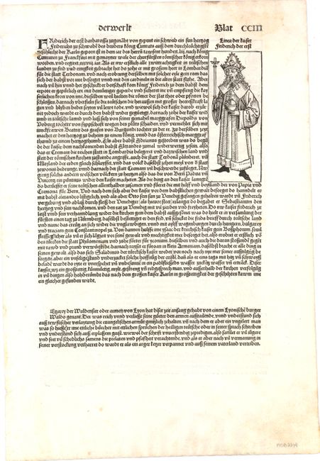 Hartmann Schedel's Nuremberg Chronicle (Liber Chronicarum) was published in two editions, Latin and German, both in 1493, appearing in print just before Christopher Columbus' discoveries completely re-shaped the European view of the World. This splendid work presented the history of the world in a pictorial encyclopedia with approximately 285 pages of text and 1,800 woodcut illustrations. Among these illustrations are views of towns and cities throughout Europe and the Near East. The majority of these views are entirely imaginary. In fact, 49 of the views are actually printed from the same group of 14 woodblocks. There are also 30 double-page views of cities with more realistic images. In addition to the topographical images, there are an enormous number of other subjects, including diagrams of the Creation, comets, family trees, portraits & biblical scenes. The text was compiled and edited by Hartmann Schedel, printed by Anton Koberger, with illustrations designed by Michael Wohlgemuth and Willem Pleydenwurff, who cut the woodblocks, probably with the assistance of their apprentice, Albrecht Durer.