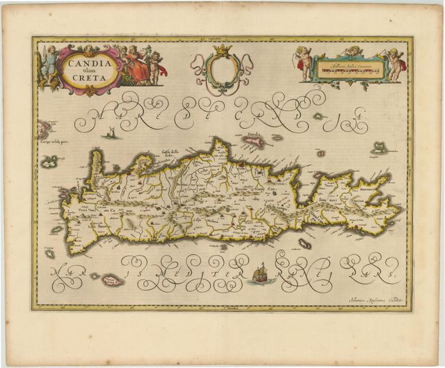 This wonderful map of the island is geographically identical to that of Joan Blaeu's map. However, Jansson has changed the cartouche configuration at top and added decorative features including figures flanking both the title and distance scale cartouches and ships sailing the seas. Crete was strategically important in the Eastern Mediterranean as it controlled the maritime routes and access to the Adriatic Sea. It is also the birthplace of Zeus, father of the gods in Greek mythology, and the site of many legends. The mythological Labyrinth where the Minotaur was confined is located near the center of the map. Latin text on verso.