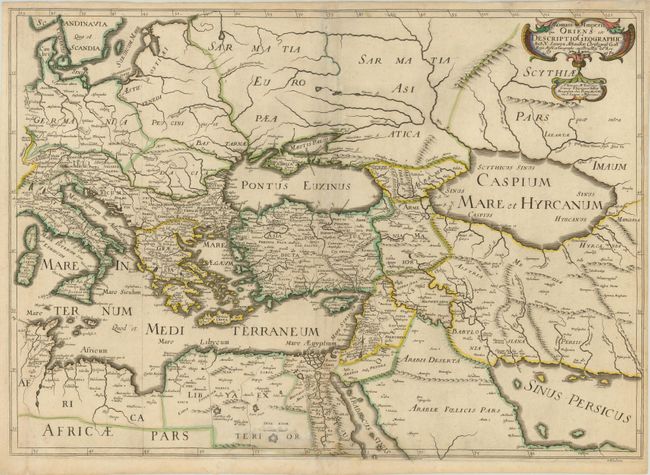 Handsome map of the eastern part of the Roman Empire. It extends from Corsica and Sardinia through the Caspian Sea and the Persian Gulf. The map is well engraved in Sanson's scientific style and embellished only with a small title cartouche.