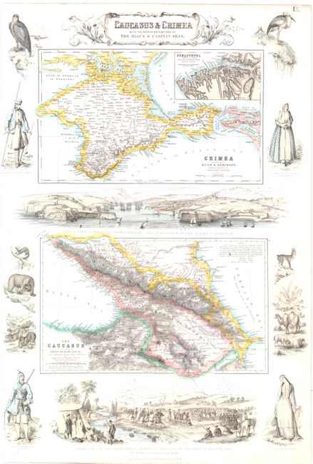 This sheet contains two detailed maps of Crimea and of the Caucasus region. The map of Crimea includes an inset of the port of Sevastopol in the southern region. Elaborate vignettes of animals, regional men and women, a military scene, and a view of Sevastopol surround the maps.