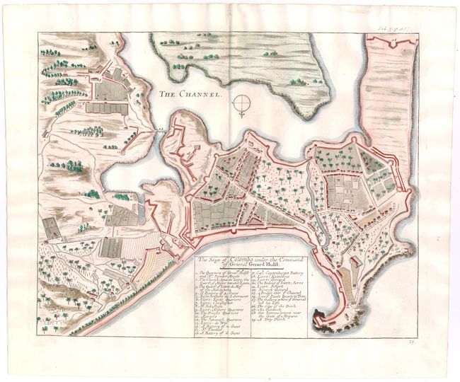 This detailed bird's-eye plan of Colombo depicts the city during the siege of Colombo under the command of Dutch General Gerard Hulst in 1656. The port town was an important trading post and changed hands between the Portuguese, Dutch and British several times. This plan depicts the fortifications, batteries, military quarters, roads, etc. with a numbered key identifying locations. A simple compass rose orients the plan with north at the bottom. This plan was published in John Churchill's "A Collection of Voyages and Travels."