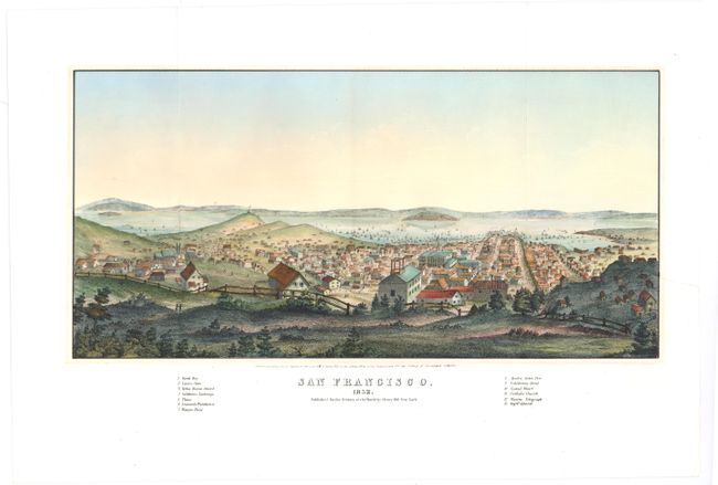An early and justly famous view of San Francisco. Thirteen points of interest are listed and keyed to the view including Contra Costa in the distance, the California Exchange, the Marine Telegraph, etc. The harbor is filled with ships and the city's growth is already evident. A remarkable, historical, early and very desirable tinted lithographic view. Printed on a full sheet that measures 17.3" x 10.3".
