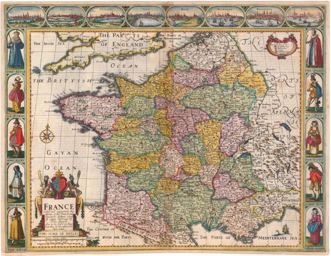 This lovely copper engraved carte-a-figures map covers France and displays the various regions in lovely color. Ten figures flank the left and right side of the map showing the King, Queen, merchant, lawyer and a farmer to name a few. Above the map are eight town plans including Paris, Orleans and Bordeaux. Imprint of George Humble in the title cartouche. English text on verso.
